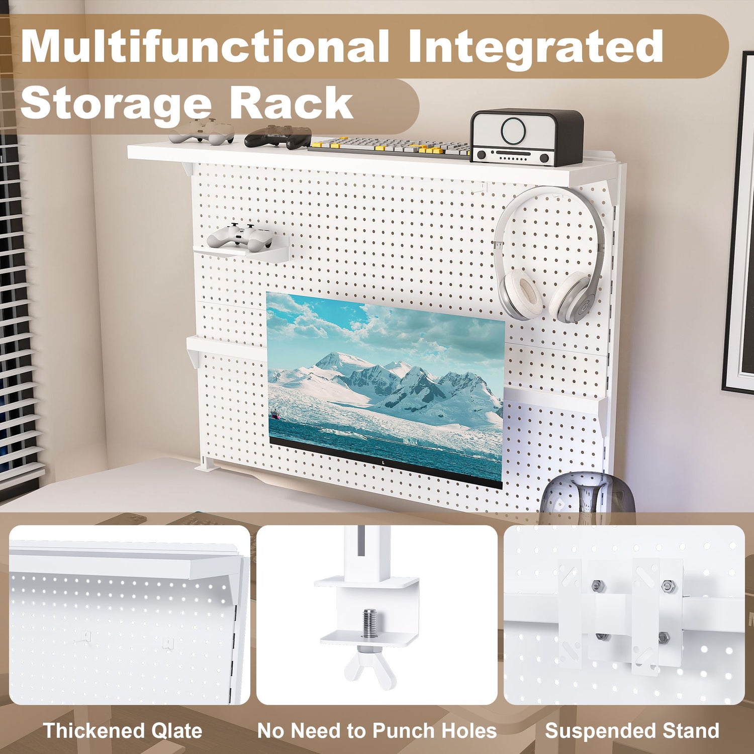 Clamp On Desk Pegboard With Single Monitor Stand, Organizer With Hooks & Movable Panel - White