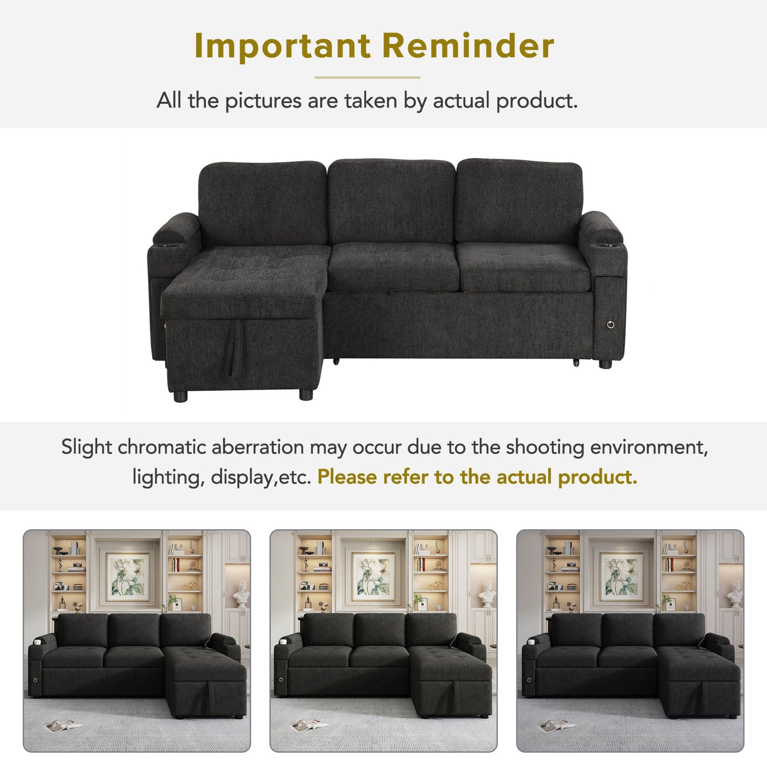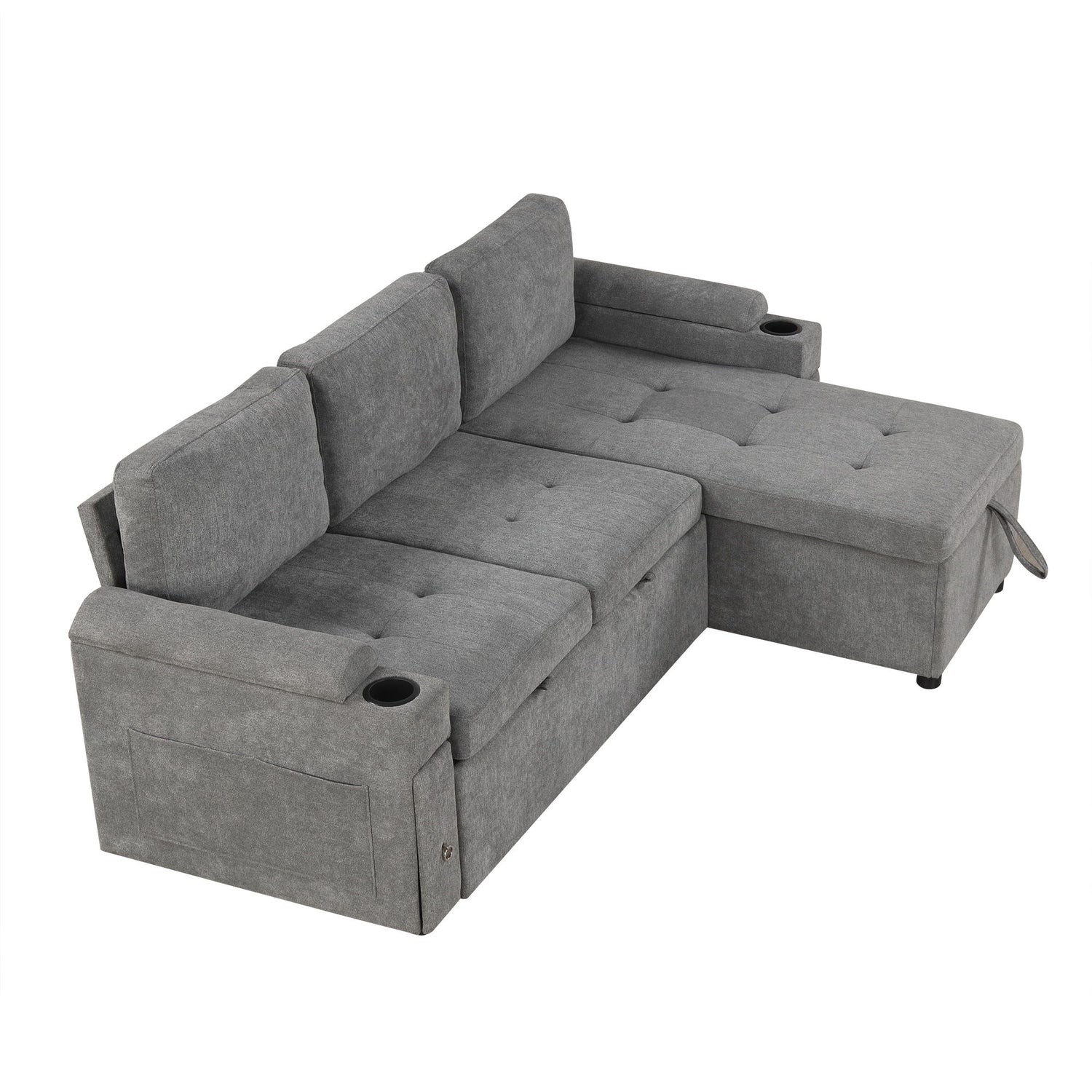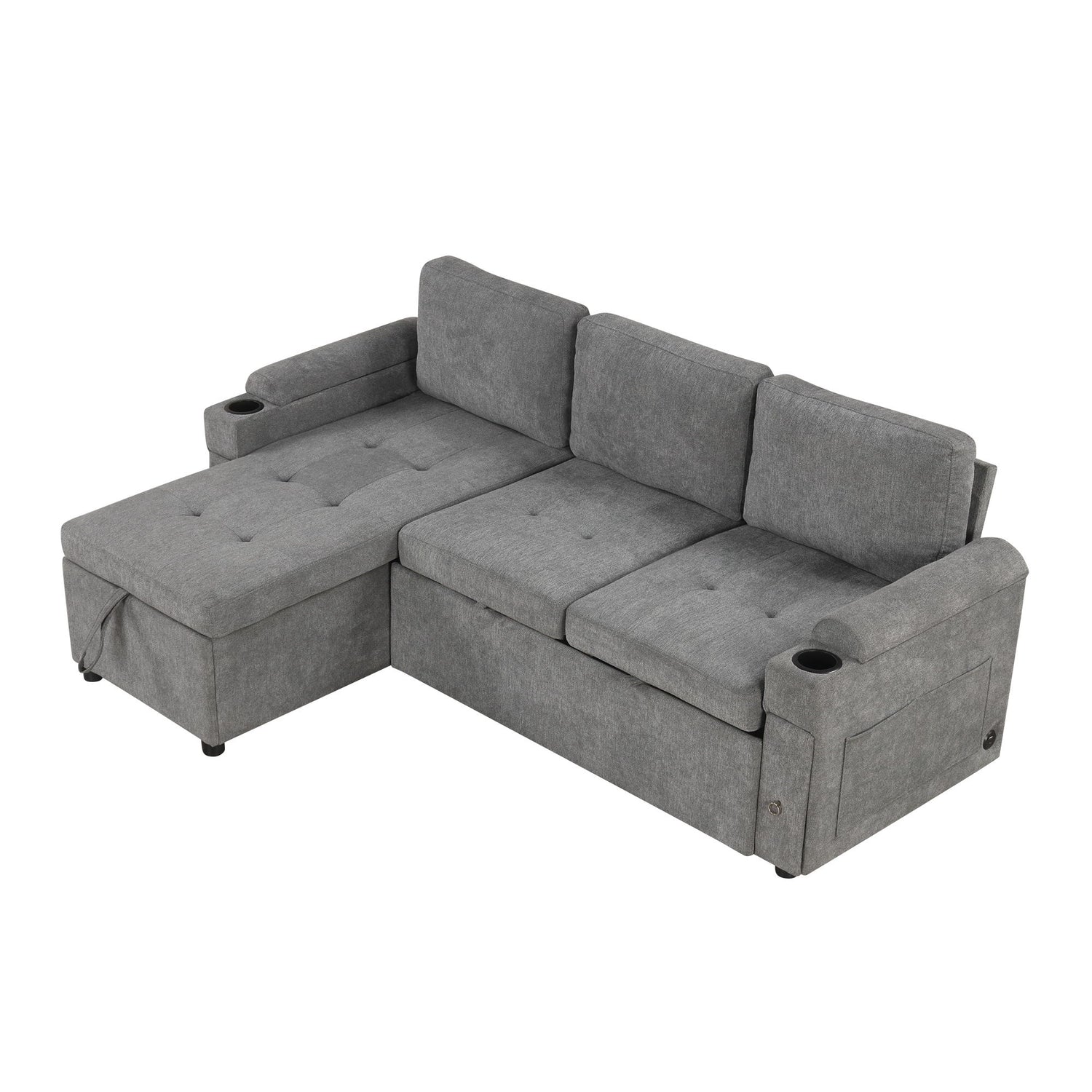 L Shaped Convertible Sofa Bed With Storage, Cup Holders, USB Ports Chenille - Gray