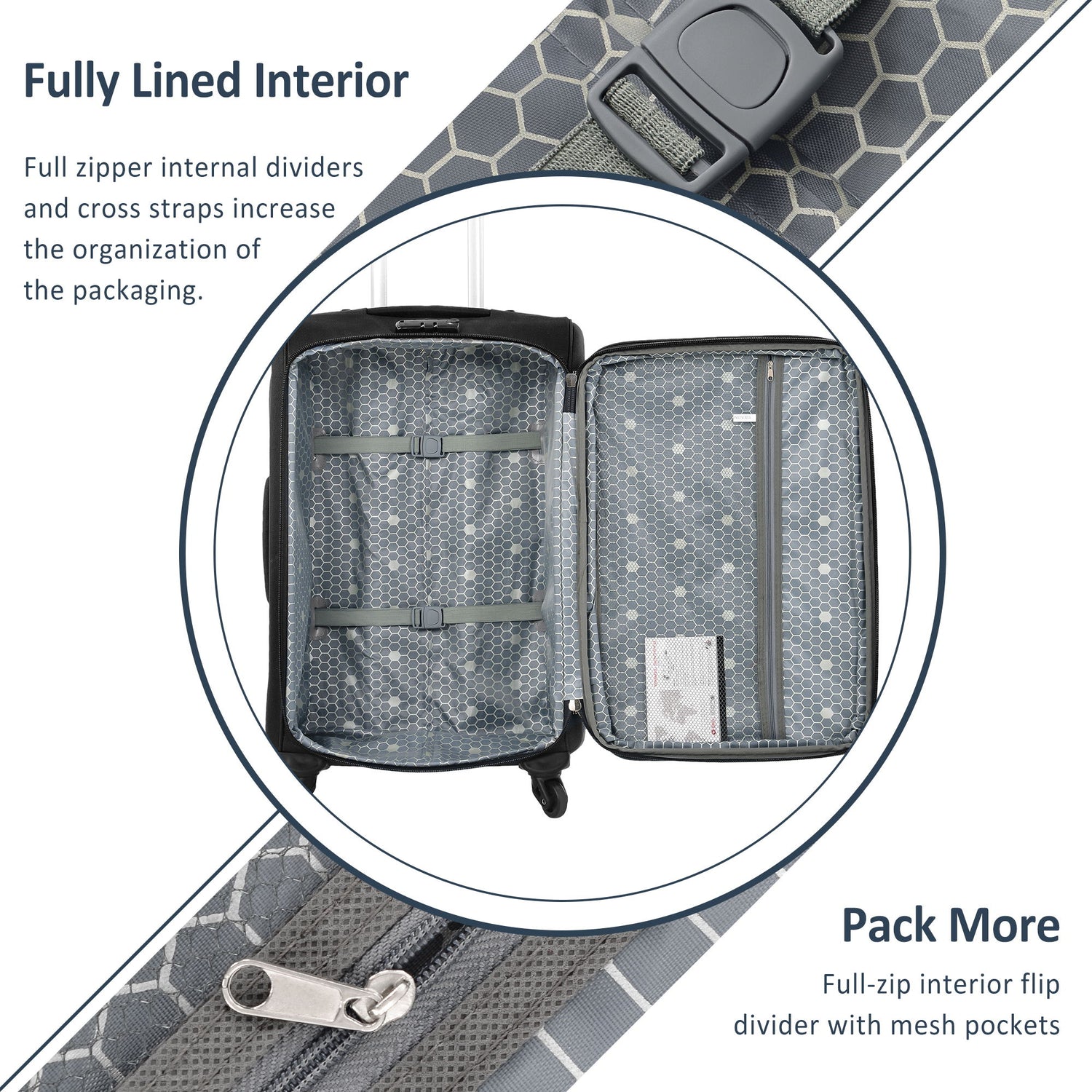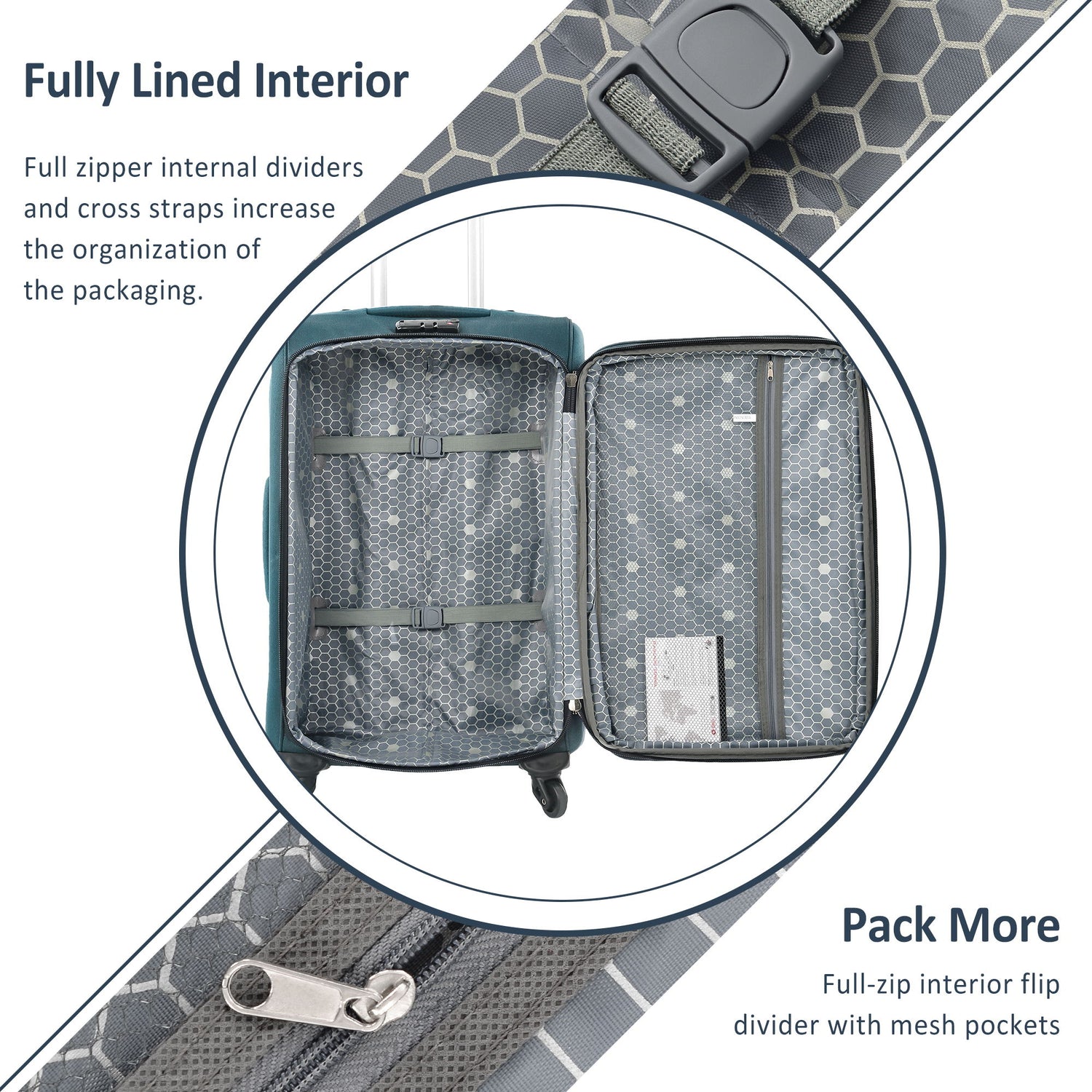 Functional Interior Design: Multiple interior packing compartments are designed reasonably to meet the requirements of travelers and make this set of luggage to be a perfect choice for most travelers. In addition, many accessories are also excellent and conducive to efficient storage, such as taping holes, durable zipper, mesh pocket, garment strap.