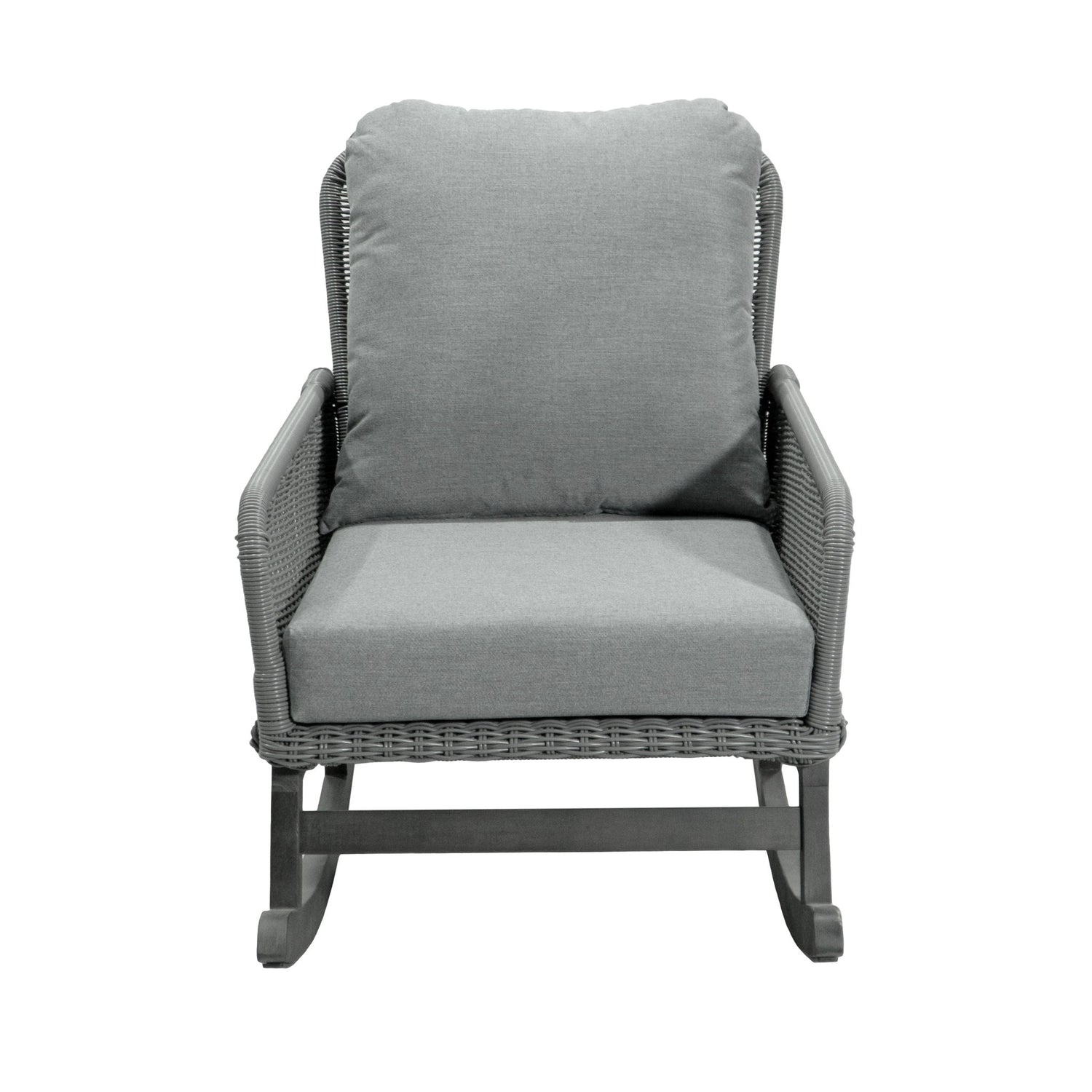 Modern 3 Piece Outdoor Seating Set With Cushioned Rattan Rocking Chairs And Wooden Accent Table - Dark Gray is backordered and will ship as soon as it is back in stock.
