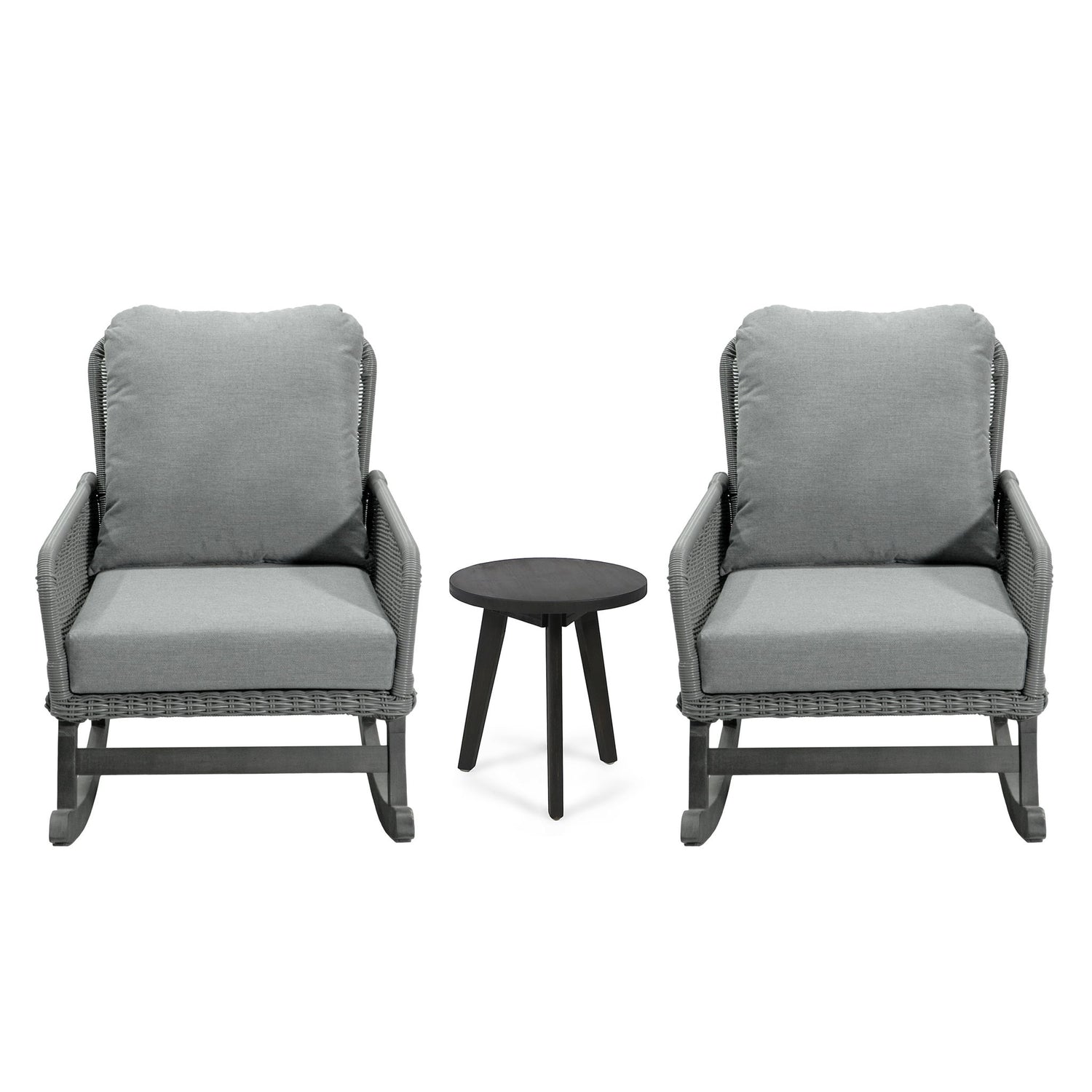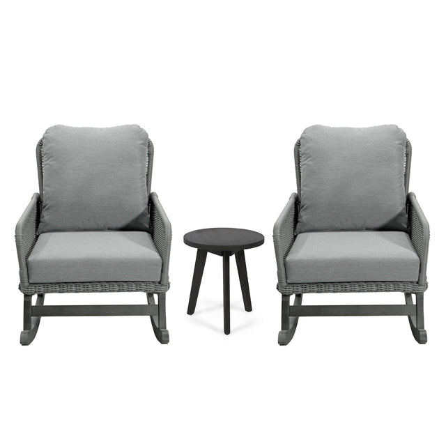 Modern 3 Piece Outdoor Seating Set With Cushioned Rattan Rocking Chairs And Wooden Accent Table For Patio Relaxation - Gray