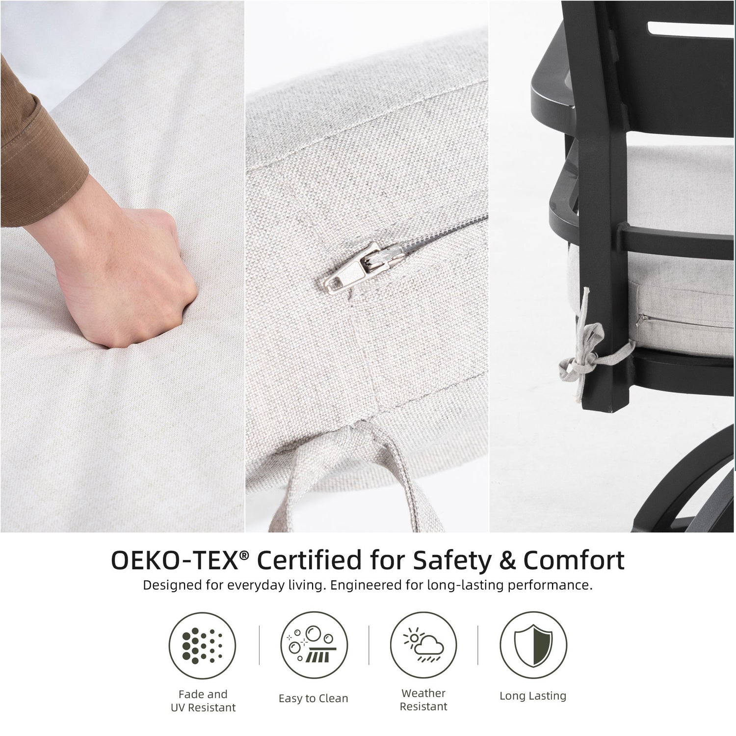 • Cushions: Made of Sunbrella fabric for durability, fade resistance, and stain resistance, with removable covers.